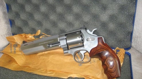 Kills me to do this, but I need the cash badly right now. I'm selling a barely shot S&W 627 Performance Center Hunter, 8 Shot, 357 Mag, Non Flutted Cylinder, Ported 6" barrel, with adjustable target rear sight. I've put maybe a 250 rounds through it since I got it, and before me the gun had just been test fired. Thing is in great cosmetic condition and perfect functional condition. The pictures I'll post are from the original owner. It looks exactly the same to this day except for some really minor fouling on the front of the cylinder. This could be removed with some thorough cleaning.